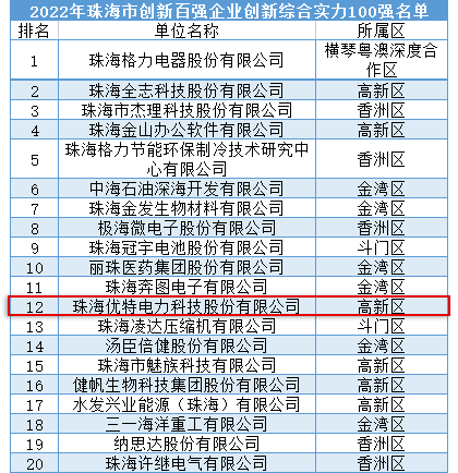 近日,珠海市科技创新局公布了2022年珠海市创新百强企业名单。入选榜单企业体现了珠海市科技发展水平,也是珠海自主创新的重要力量。优特科技凭借过硬的综合实力,入选创新综合实力百强与经济贡献百强名单。