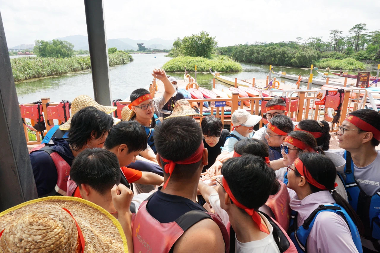 比赛哨声响起,鼓槌落,船桨起,五支龙舟队争先恐后地向终点线划去。350米的水上竞逐,队员齐声呐喊,鼓声震耳欲聋,活动现场气氛高涨。“乘风队”队员默契无间,凭借团结精神和持久耐力,超越一支又一支队伍,率先冲过终点线。当竞速的最后一只龙舟划过终点,宣告这次赛龙舟活动圆满结束。