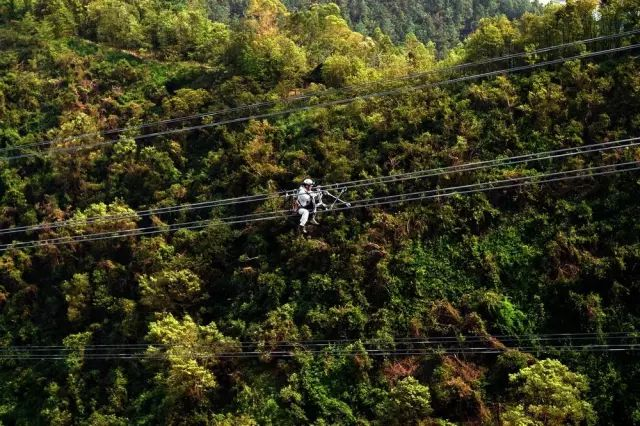▲ 南方电网广东电网公司工作人员被直升机悬吊至500千伏带电线路上,随后开展带电作业。赖增鹏 摄