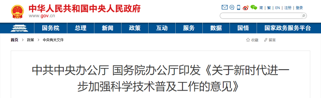 科学技术普及(以下简称科普)是国家和社会普及科学技术知识、弘扬科学精神、传播科学思想、倡导科学方法的活动,是实现创新发展的重要基础性工作。党的十八大以来,我国科普事业蓬勃发展,公民科学素质快速提高,同时还存在对科普工作重要性认识不到位、落实科学普及与科技创新同等重要的制度安排尚不完善、高质量科普产品和服务供给不足、网络伪科普流传等问题。面对新时代新要求,为进一步加强科普工作,现提出如下意见。