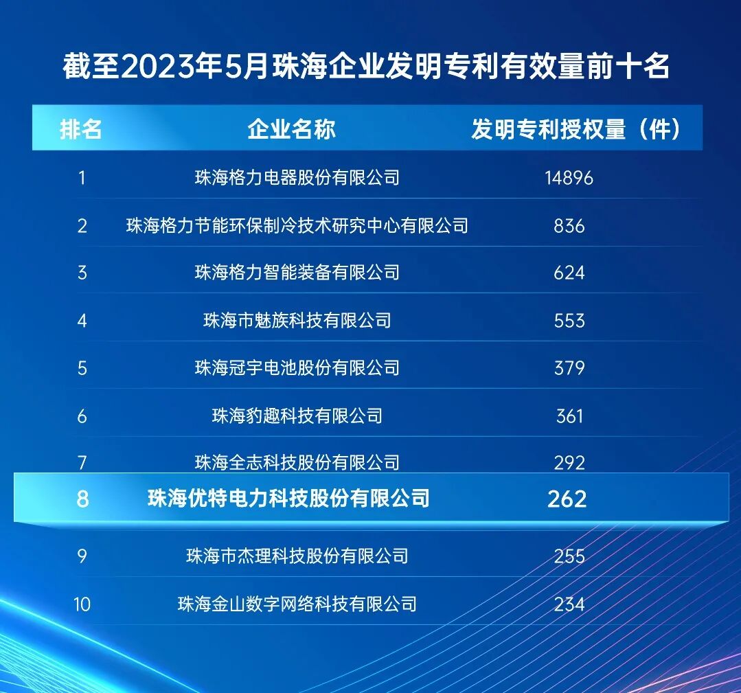 8月2日,珠海市知识产权局发布了2023年1-5月珠海市知识产权简报,优特科技以262件发明专利位居珠海企业发明专利有效量第8名。