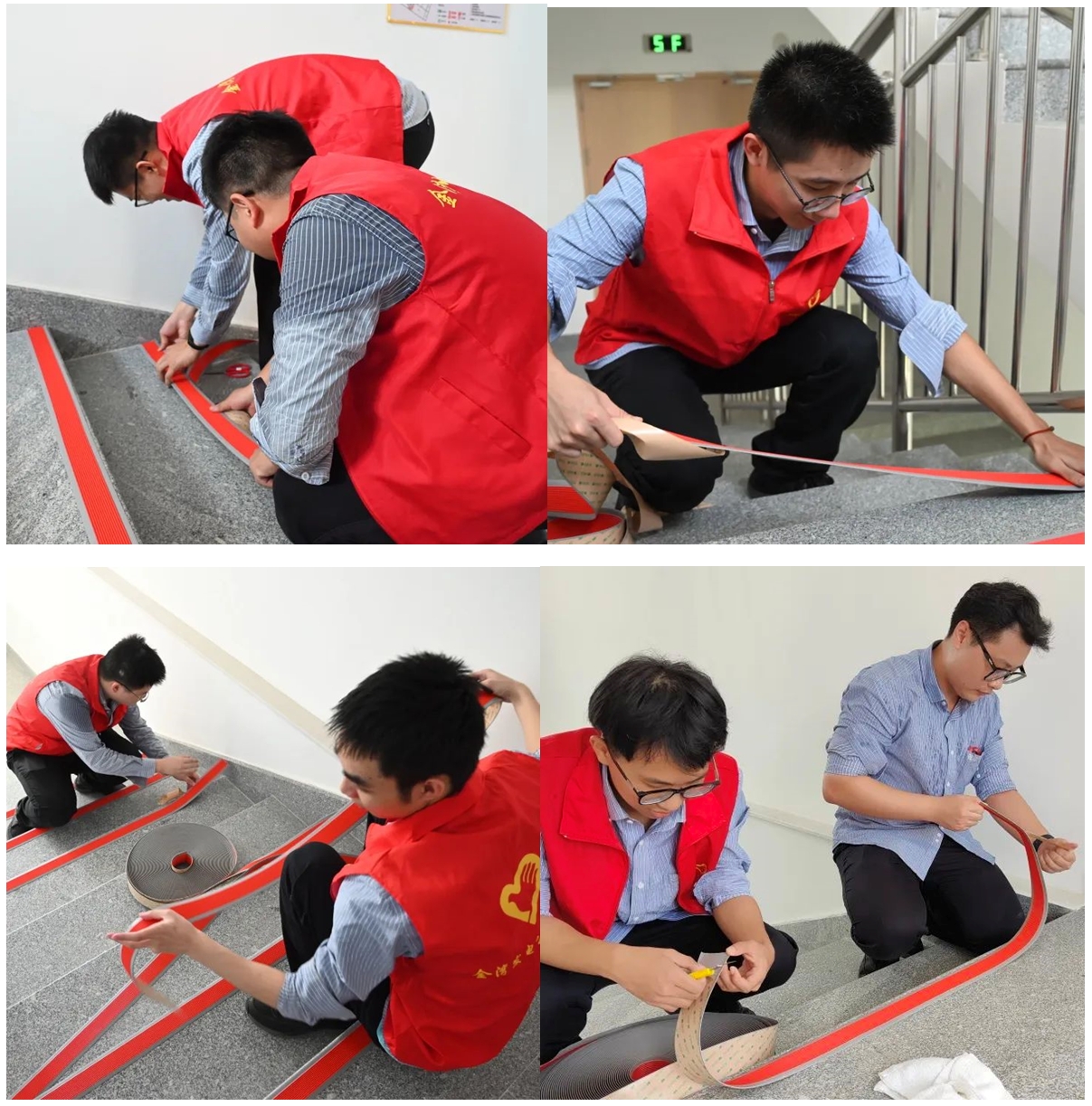在大家的通力合作下,顺利完成了两侧楼梯所有楼梯格防摔条的粘贴,为6位老人搬运物品、布置房间。