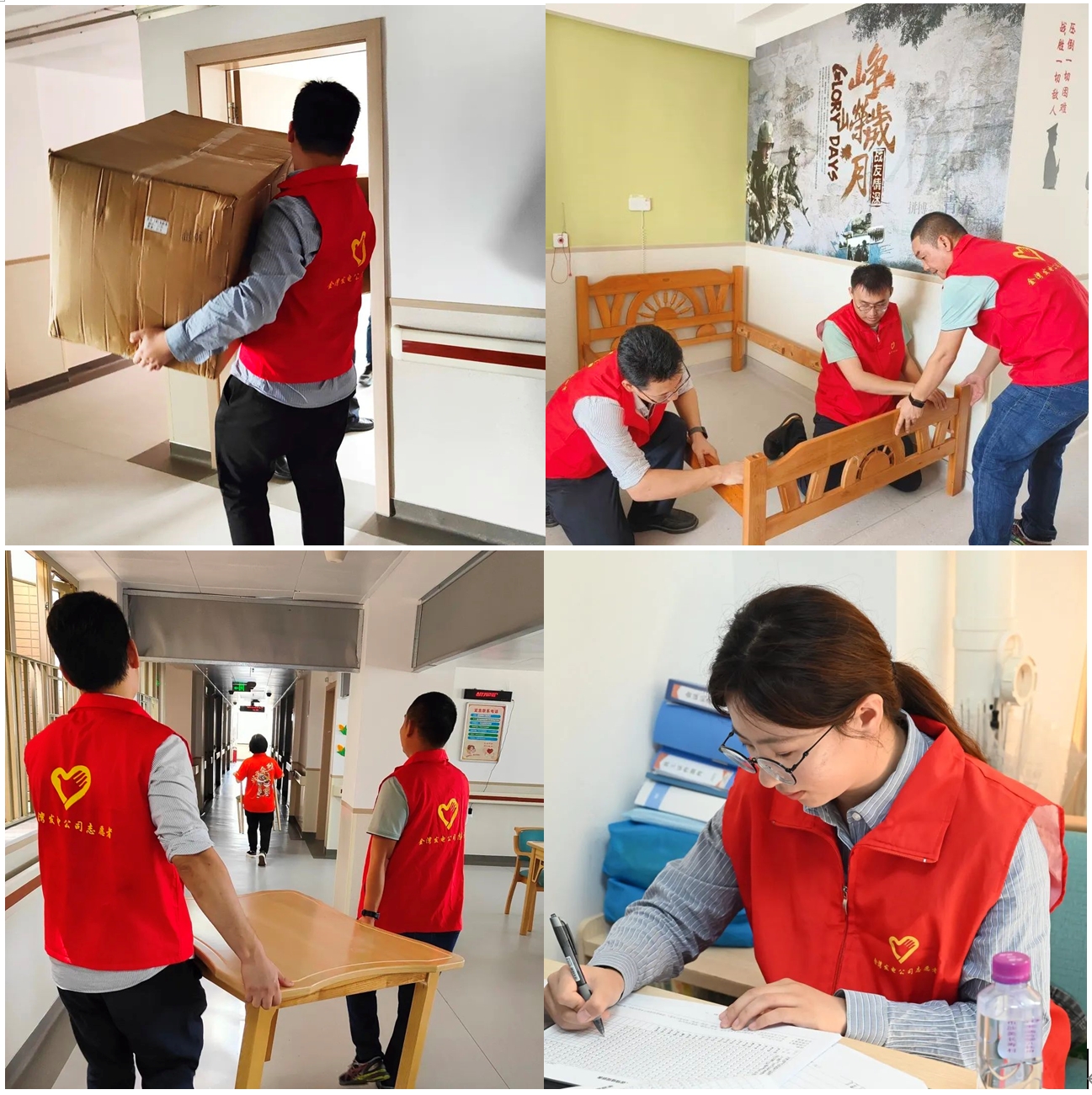 来到平沙社会福利中心后,志愿者们迅速分组,立刻行动,给两侧七层楼梯粘贴防摔条,协助社区工作者搬运老人的床、桌子、凳子等物品,帮忙整理老人起居台账资料。