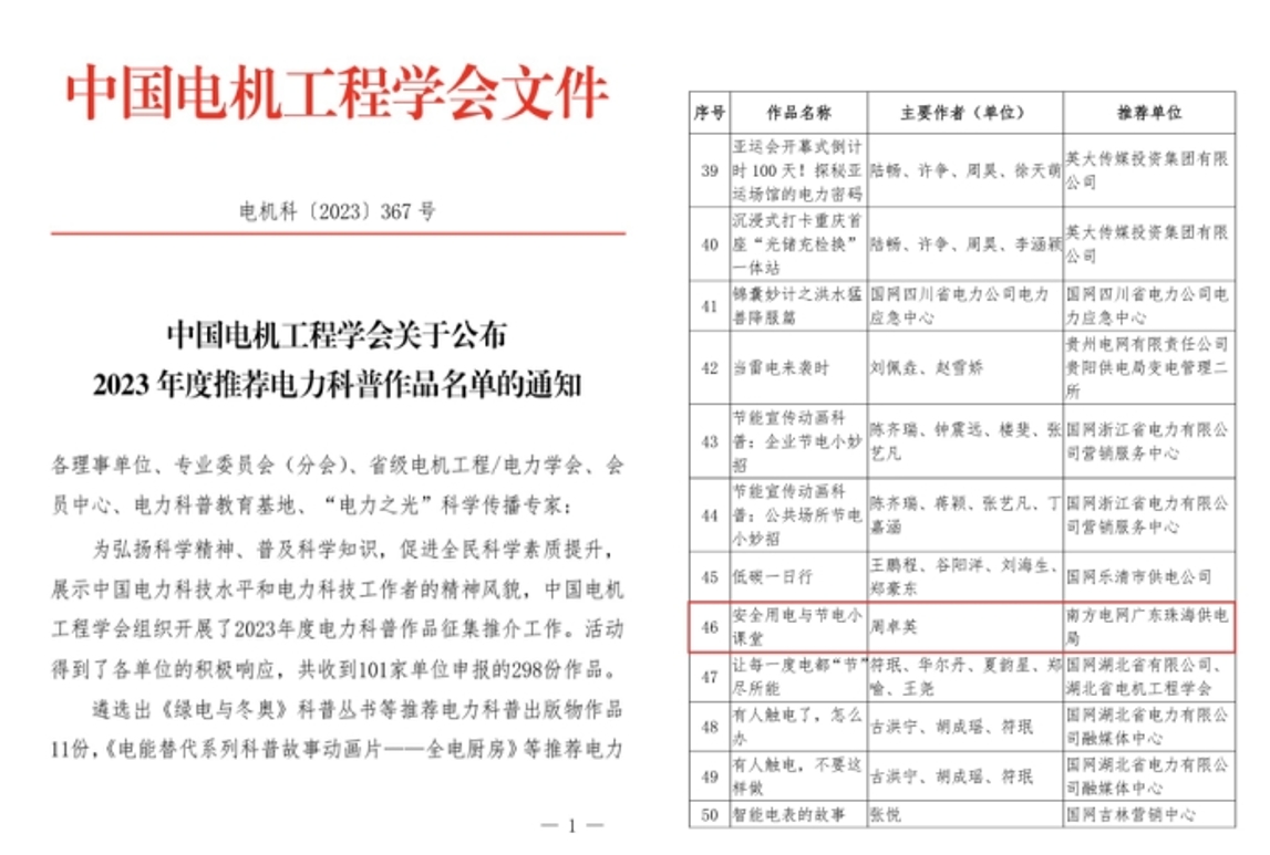 三是开展电力科普作品创作和传播。围绕电力行业前沿科技进展和科技常识等,组织创作、征集科普图文和短视频,打造电力科普资源库,形成网站、微信公众号、会刊等多渠道广泛传播,发布安全节能用电、电力设施保护、电力需求侧响应、新能源储能技术等电力科普视频作品共6个,其中珠海供电局《安全用电与节电小课堂》科普视频荣获中国电机工程学会2023年度推荐电力科普作品,组织编撰省学会《安全用电系列科普丛书》,组织科普视频2个、科普展览1项申报“典赞·2023科普中国”推选活动。