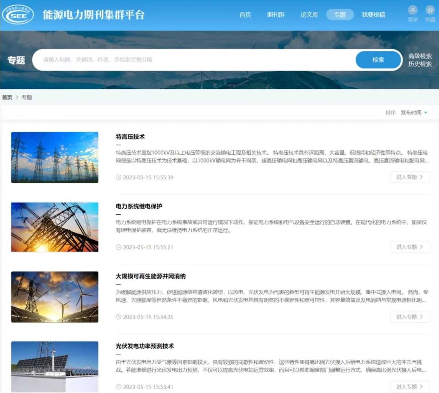 3.期刊专题论文展示:专题论文用以展示能源电力系列期刊积极组织高质量、高水平研究成果和研究进展。专题详情页可展示专题名称、专题封面、专题简介、专题创建时间以及专题所关联的文章资源,将文章内容更加集中合理的归类,方便用户针对性的查看。