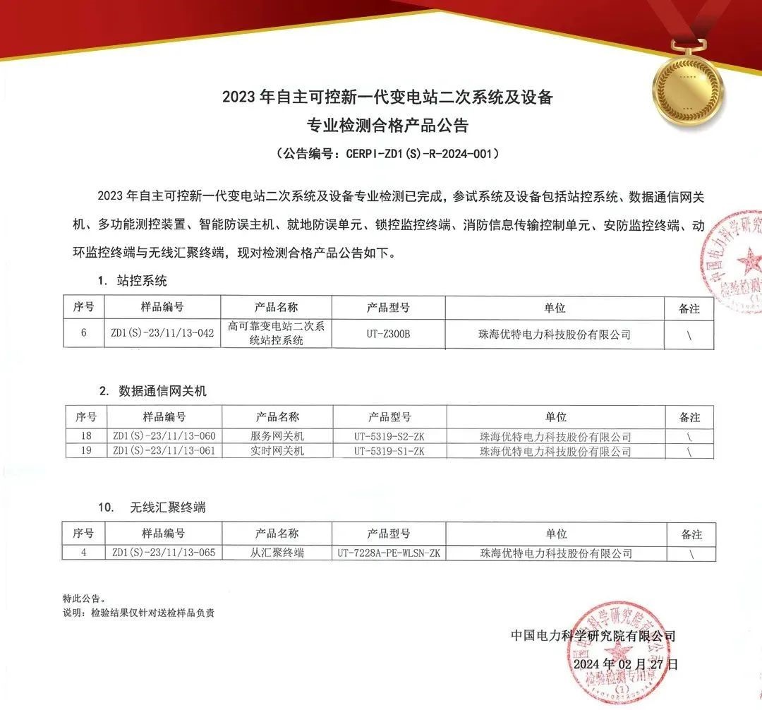近日,中国电力科学研究院发布关于2023年高可靠变电站二次系统专业检测合格产品公告,优特科技送检的UT-Z300B高可靠变电站二次系统站控系统、UT-5319-S1-ZK实时网关机,UT-5319-S2-ZK服务网关机、UT-7228A-PE-WLSN-ZK从汇聚终端均顺利通过试验检测。
