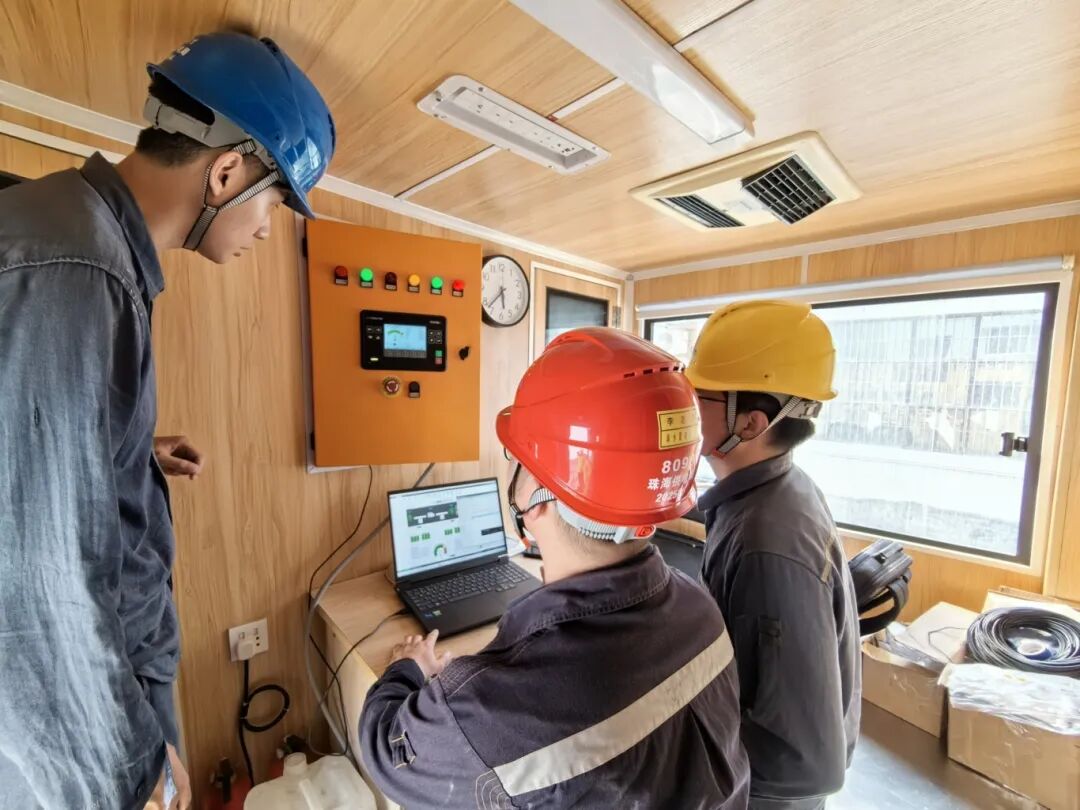 ▲图为金湾创客团队成员在实际检修作业中对低压发电车无缝并离网装置进行测试运用