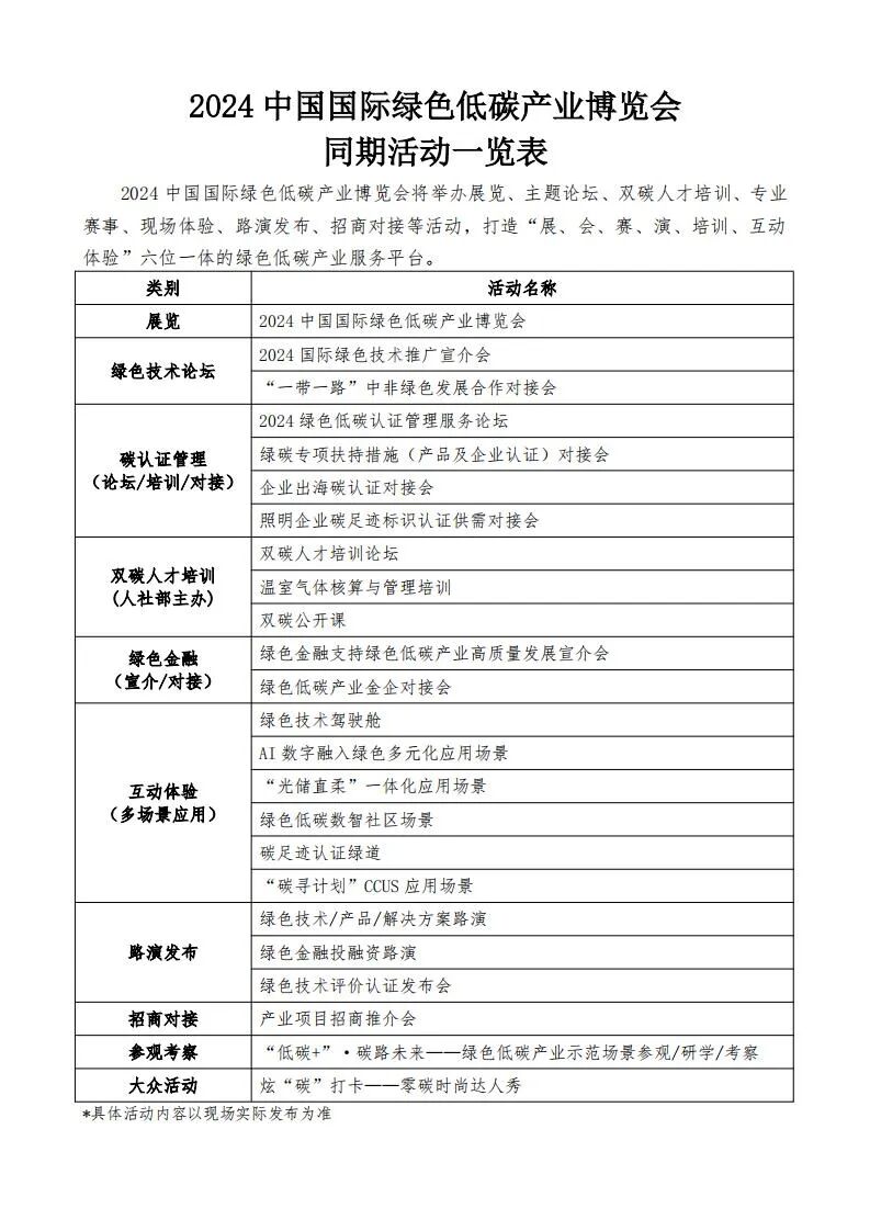 (一)同期活动:2024中国国际绿色低碳产业博览会将举办综合展览、主论坛、主题论坛、双碳人才培训、专业赛事、现场体验、路演发布、招商对接等活动,打造“展、会、赛、演、培训、互动体验”六位一体的绿色低碳产业综合服务平台(见附件2)。